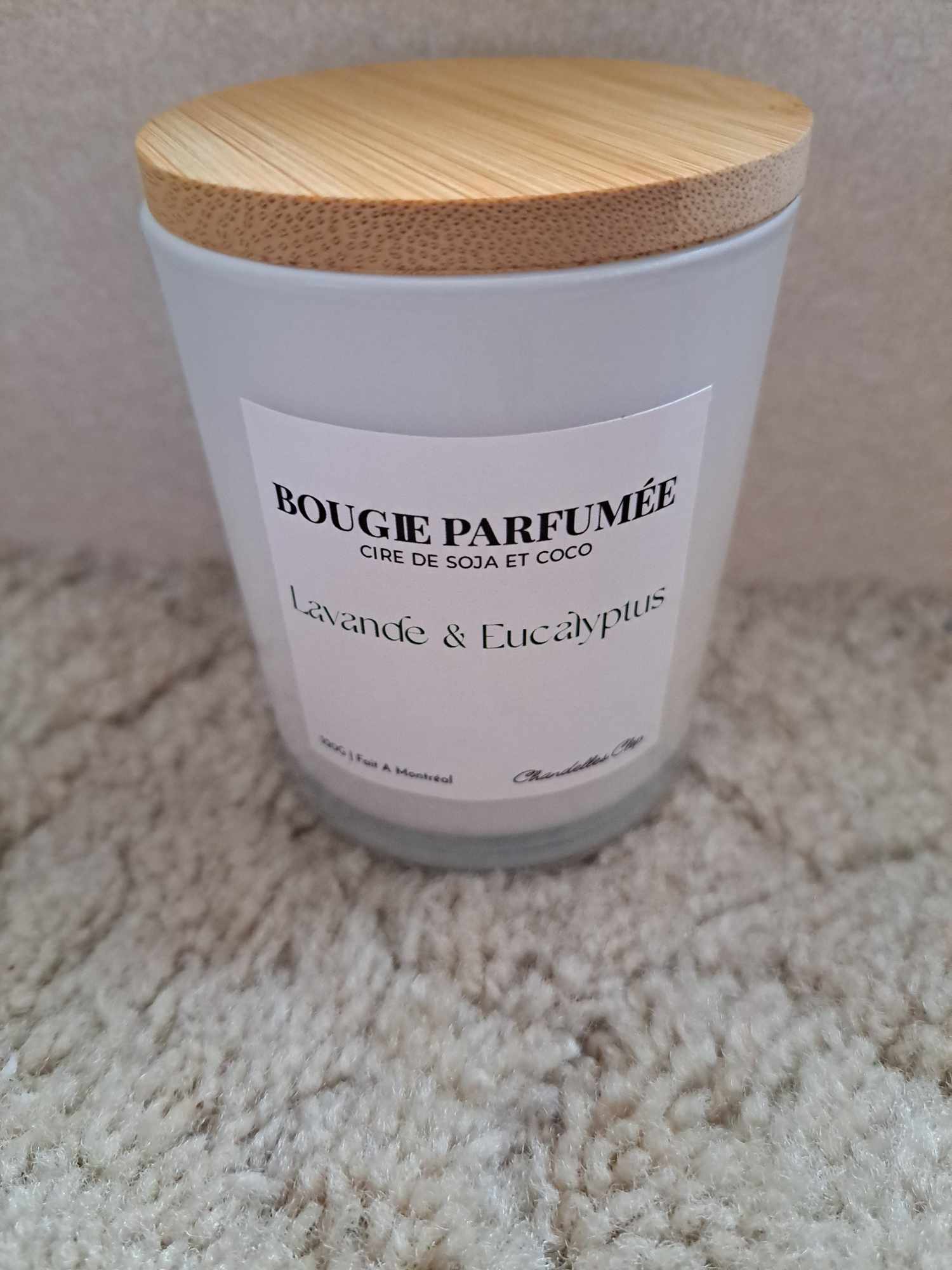 Cire luxueuse 100% naturelle et végétale de noix de coco et soja, mèche de coton, fragrance sans phtalates produite au Québec.
